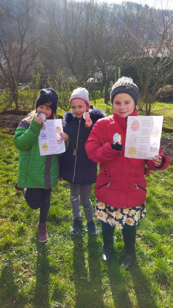 Easter Egg Hunt je (anglosaská) tradice, při které děti hledají na Velikonoční neděli ráno v zahradě velikonoční vajíčka, často se splněním nějakého úkolu. My jsme se naučili anglickou jarní básničku.