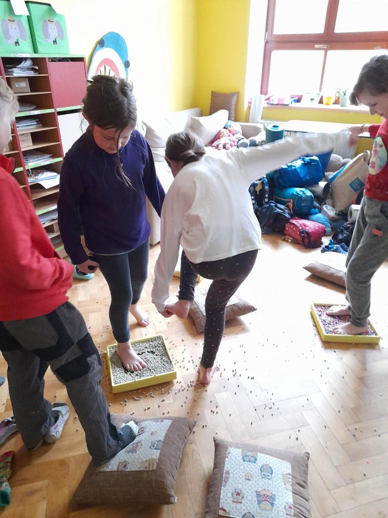 2. Zážitková dílna se stínovým divadlem byla motivovaná povídkou „Růžová mušle“. Po přečtení začala nejprve hmatovým chodníčkem, na kterém si děti bosou nohou vyzkoušely nejrůznější povrchy: hrách, dřevěné kostičky, kostičky lega, korálky a někteří odvážlivci si troufli i na destičky s hřebíčky s oblou hlavičkou. Představovaly si přitom, že jdou po útesech pro růžovou mušli. Poté si děti vyrobily loutky a kulisy k pohádce a hrály stínové divadlo. Každý si vyzkoušel více rolí a opakovaně mohl prožít přečtený příběh a nechat doznít jeho závěr: „Ale růžová mušle už na skále nebyla. Moře ji odneslo. Jak to, že se dala odnést? Má ráda moře. Jak to, že se pustila skály? Pustila se, protože CHTĚLA.“ Kdo se nezapojil do stínového divadla, dostal další nabídku od Daisy Mrázkové a tou byl příběh Jeleni. Děti tentokrát sehrály činohru o pavoučkovi, který se snesl na jelení parohy a nechal se unášet krajinou: „Hou hou, stíny jdou, bílou mlhou houštinou…“ I tohle představení bylo velmi povedené.