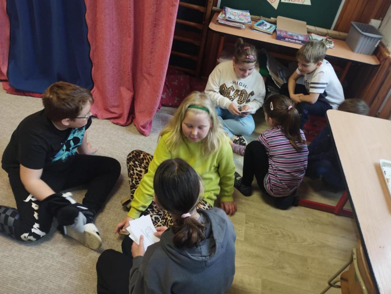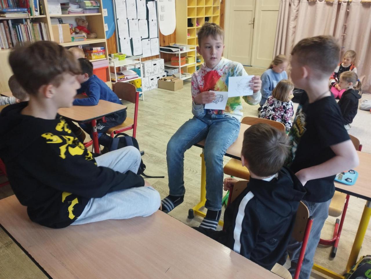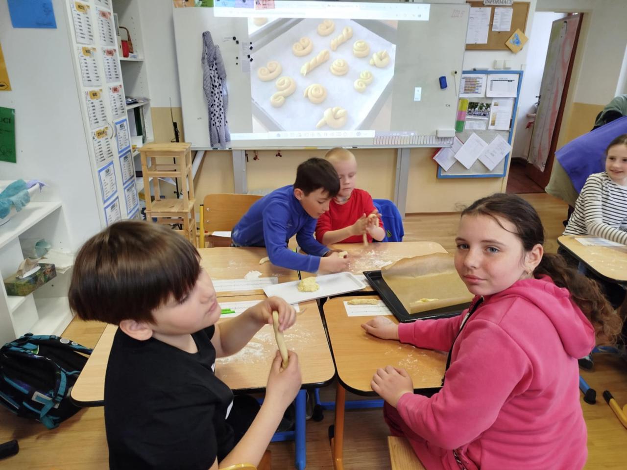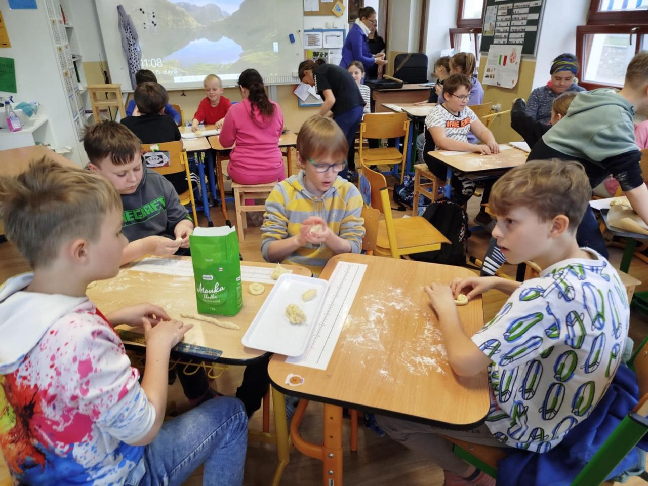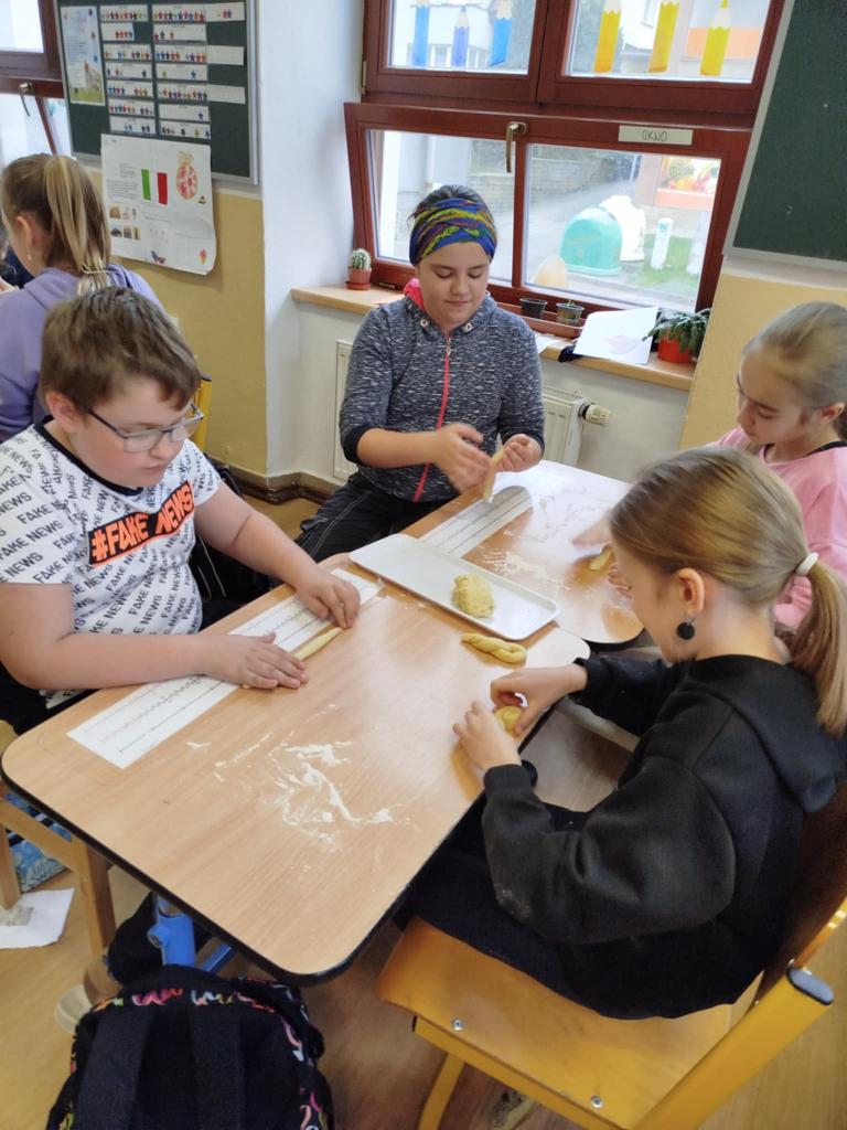 Čtvrťáci s páťáky připravili, navážili, odměřili, vytvarovali a upekli vynikající jidáše podle "zmateného receptu", který se jim podařilo sestavit. Naučili se rýsovat hlavolam - tangram "Kolumbovo vejce" a vytvořili krásná velikonoční přání.