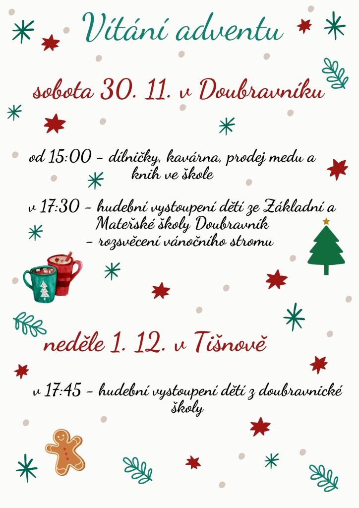 Dne 30. 11. 2024 přivítáme adventní čas v Doubravníku. Od 15 hodin bude možné navštívit dílničky ve škole, zakoupit si produkty od včelaře nebo knihy. Občerstvit se a rozjímat budete moci v naší kavárně. V 17:30 se všichni přesuneme k vánočnímu stromu na náměstí, který za doprovodu hudebního a pěveckého vystoupení dětí ze Základní i Mateřské školy společně rozsvítíme.